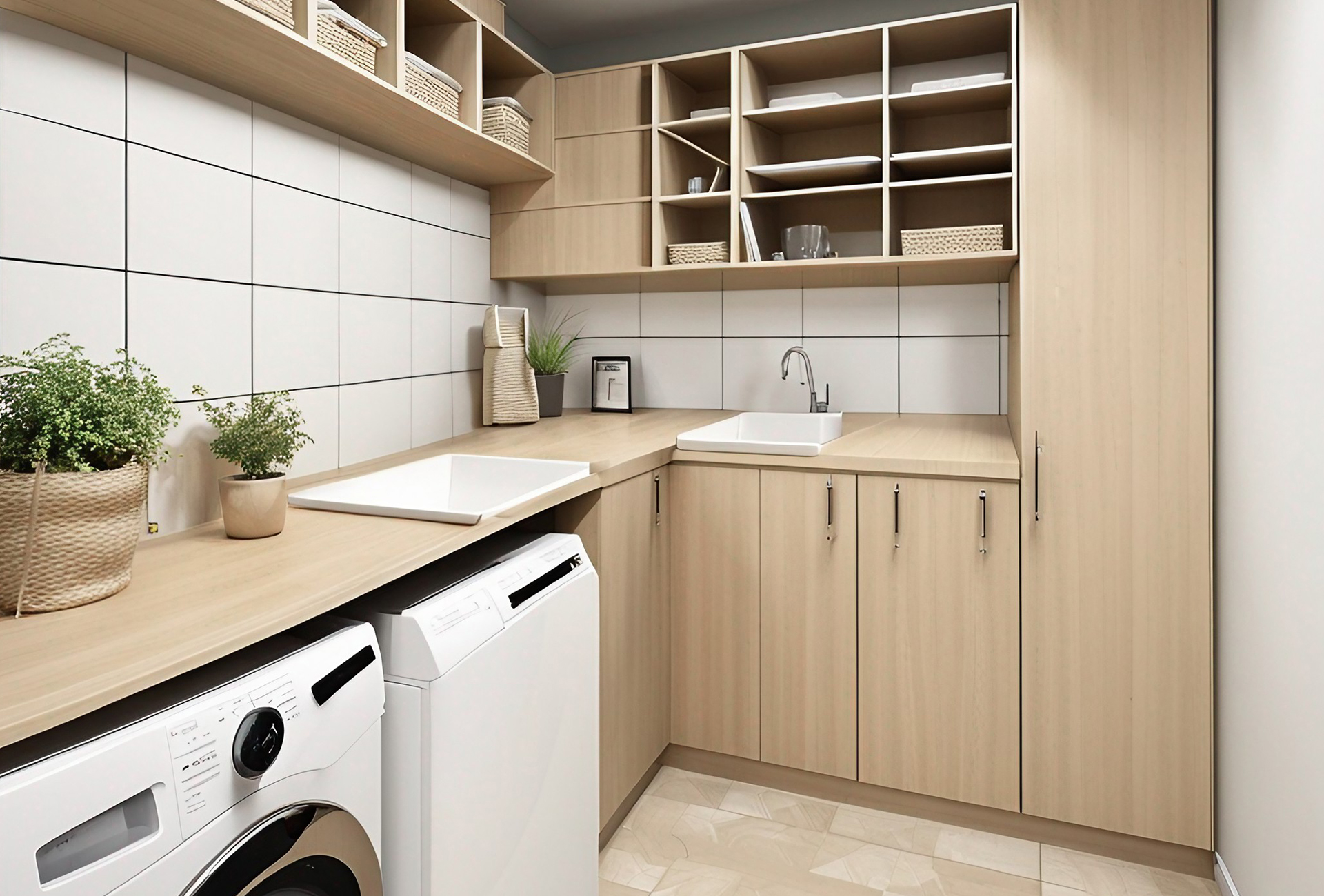Eco-responsible furniture and cabinets that can increase the functionality of the utility room by adding additional workspace or storage surfaces, allowing for more efficient use of the space.